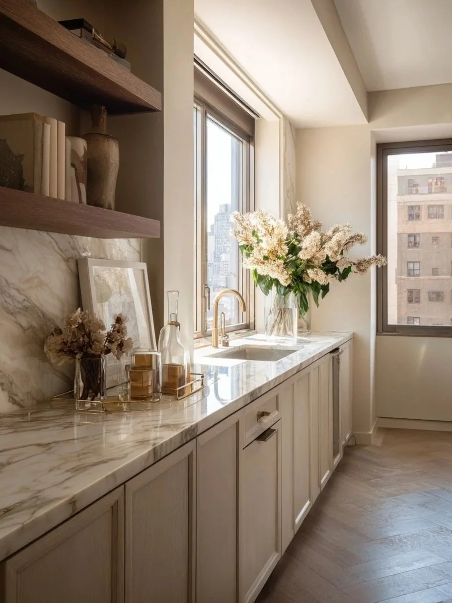 Custom millwork and tailored furnishings are integrated with precision, creating moments of intimacy within the broader spatial flow. The open bar counter is conceived as a discreet extension of the living spaces, where natural stone, warm wood cabinetry, and understated bronze accents reinforce the material language of the home.